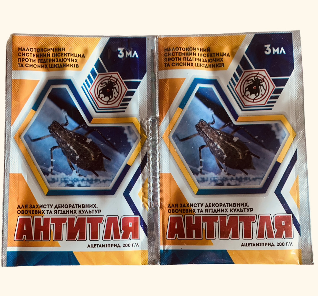 Антитля, 3 мл - препарат для знищення тлі, гусениці, листожерок, кліщів, блошок, дроту, капустяного та морквяного водоростей, лопух, довгоносика, вогнетривки, бурякової куртки, совки, лугового лугового метелика, садової толстоніжки та інших комах — шкідників.